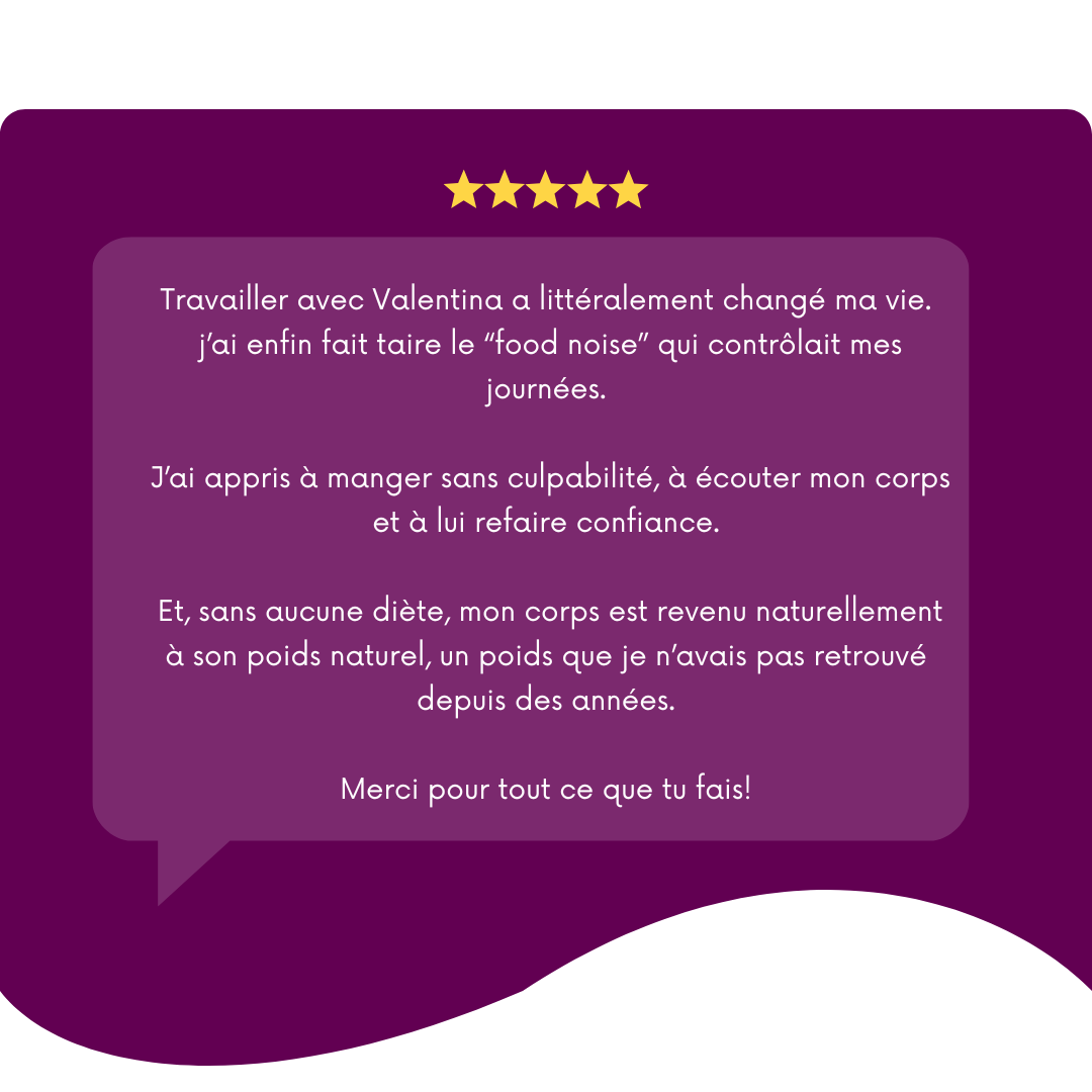 Aujourd’hui, j’accompagne les femmes Ă  se libĂ©rer des rĂ©gimes, Ă  retrouver la confiance, et Ă  faire la paix avec la nourriture ... une fois pour toutes.
